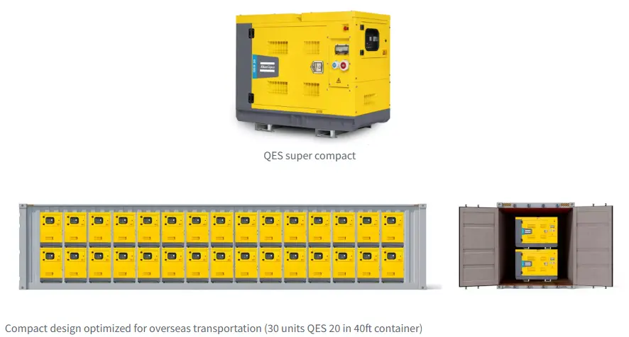 Инновациялық супер ықшам QES моделі ең тиімді тасымалдауды қамтамасыз ету үшін жасалған. Сіз 40 фут контейнерге 30 бірлікке дейін Atlas Copco QES 20 сыйдыра аласыз, бұл нарықтағы 20 кВА қуатты Атлас генераторы үшін ең көп! Бұл оңтайландырылған көлікті, CO2 шығарындыларын азайтуды және пайдалану шығындарын білдіреді, соның нәтижесінде жалпы меншік құны (ТШО) төмендейді. Оның экологиялық таза дизайны оны шетелде сақтауға өте ыңғайлы етеді, бұл сіздің сайттағы ізіңізді экспоненциалды түрде азайтады.