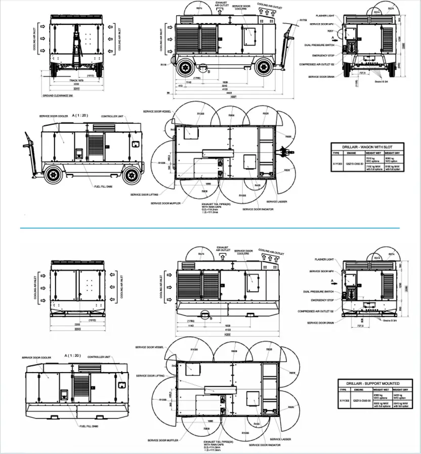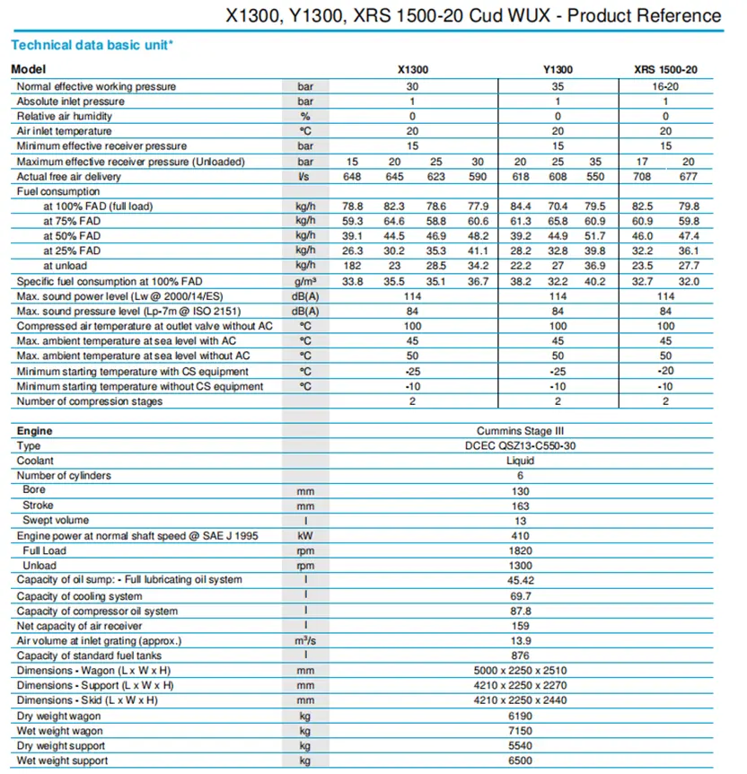 Atlas Copco X1300, Y1300 және XRS 1500-20 дыбыссыз, екі сатылы, май айдайтын бұрандалы компрессорлар, сұйық салқындатылған, алты цилиндрлі Cummins дизельді қозғалтқышымен жұмыс істейді.