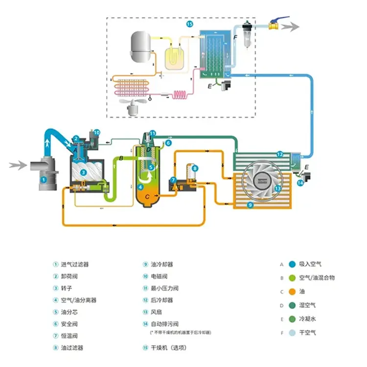 2. Көмекші жүйелер: оның ішінде майлау майы жүйесі, салқындатқыш су жүйесі, электрлік басқару жүйесі және т.б., ауа компрессорының қалыпты жұмысын қамтамасыз ету үшін қолданылады.