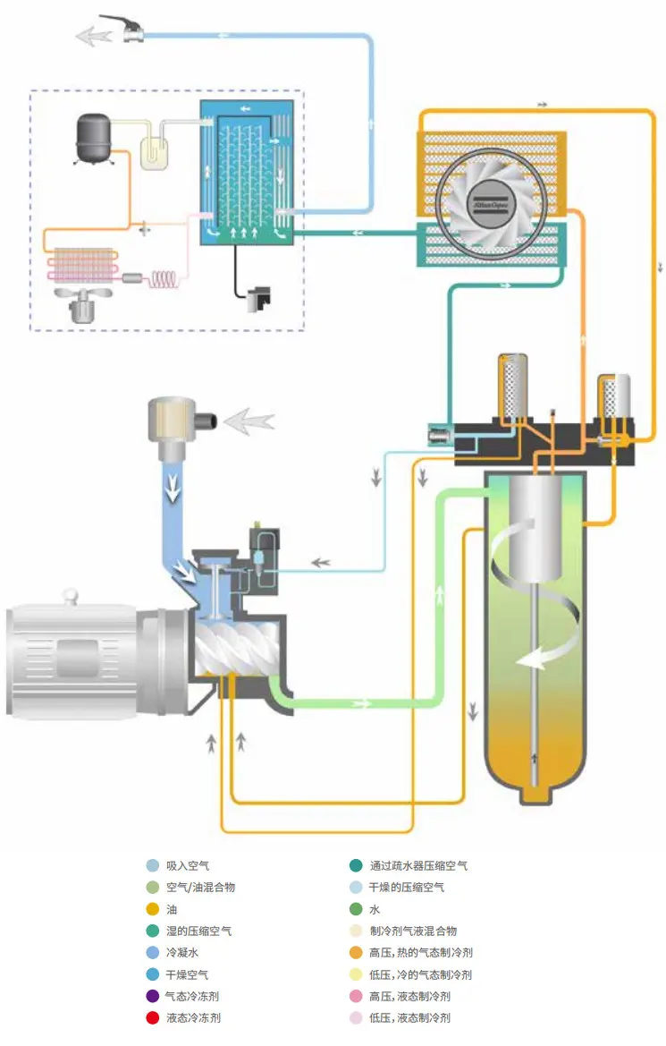· Кейінгі салқындатқыштағы су сепараторы негізінен суды кетіре алады. Ол автоматты дренажға қол жеткізу және сығылған ауаның жоғалуын азайту үшін электронды төгу клапанымен стандартты түрде жеткізіледі.
