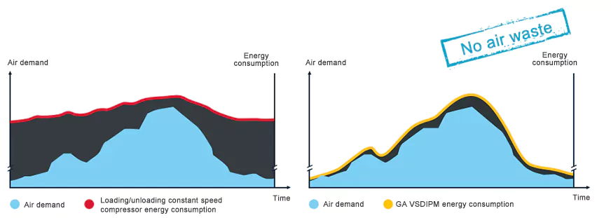 Atlas Copco VSDiPM сериясы тұтынушылардың газды пайдалану талаптарын дәл бақылау және қанағаттандыру үшін қозғалтқыш жылдамдығын автоматты түрде реттей алады. Белгіленген жылдамдықпен басқарылатын компрессорлармен салыстырғанда, VSD ауыспалы жиілікті ауа компрессоры энергияны орташа есеппен 35%-ға дейін үнемдейді.