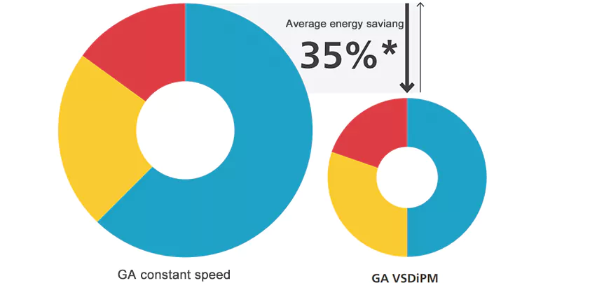 Жоғары тиімді VSDiPM сериялы компрессорлар белгіленген жылдамдықпен басқарылатын компрессорлармен салыстырғанда энергияны орташа есеппен 35%-ға* дейін үнемдейді.